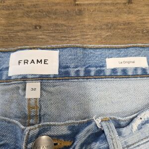 Classic light blue jeans by Frame. Features a button fly and timeless style.