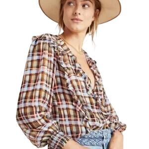 Anthropologie Plaid Ruffle Blouse - Brown, Blue, White