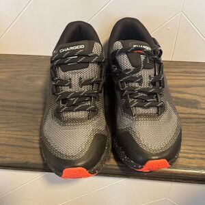 Under Armour athletic shoes in gray and red. Features speckled sole and Gore-Tex material.