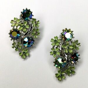 Make a bold statement with these vintage paisley-shaped clip-on earrings, bursting with color and sparkle. Likely crafted in the early–mid 1960s, they showcase the era’s love of aurora borealis rhinestones and whimsical enamel detailing. Each silver-tone earring features a trio of large AB stones that shimmer with every movement, framed by delicate lime green enamel flowers with matching rhinestone centers. The curved, organic silhouette evokes a floral vine motif, perfect for collectors and lovers of retro glam.