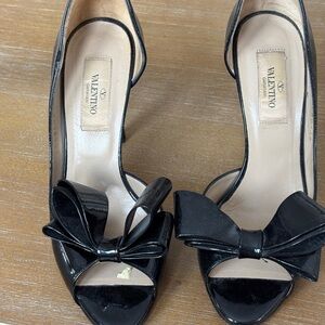 Elegant black patent leather heels with a stylish bow accent. Perfect for sophisticated events.