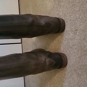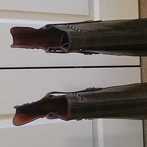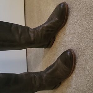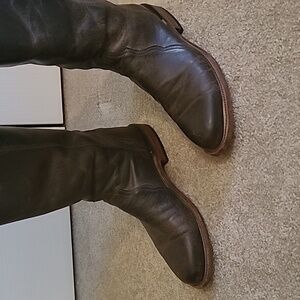 Lucchese distressed brown leather riding boot with over the knee fronts and embossed stud detail. Pull on styling, NO zipper entry. Gorgeous and comfortable. Perfect for leggings, mini skirts, and shorts! 👢💕