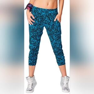 "I WANT MY ZUMBA" CROPPED HAREM "SPICY" DANCE PANTS SMALL BLUE BLACK GRAFFITI