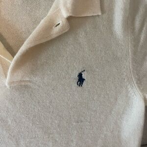 Classic Ralph Lauren polo shirt in cream. Cashmere short sleeve sweater. Features a short sleeve design with a signature logo.
