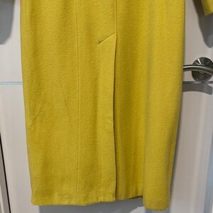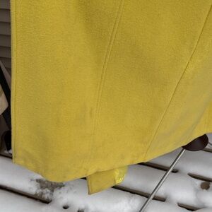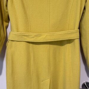 Lemon color. Wool blend. Belt is removable and can be worn without it. Hidden buttons.