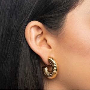 Introducing our Ribbed Chunky Hoops, featuring 1.2" hoops with a stylish ribbed finish. Designed for comfort with a secure butterfly closure, these earrings are lightweight and perfect for everyday wear. Versatile enough to transition seamlessly from day to night, they add a touch of sophistication to any outfit.