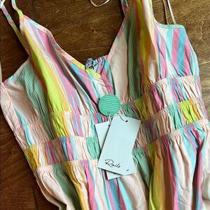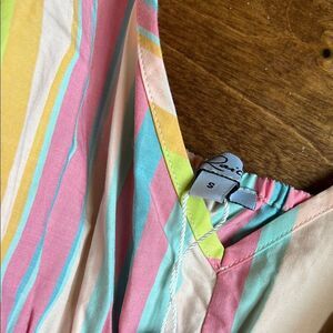 Chic dress with vibrant stripes. Features V-neck and adjustable straps.