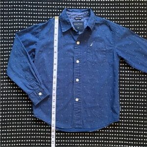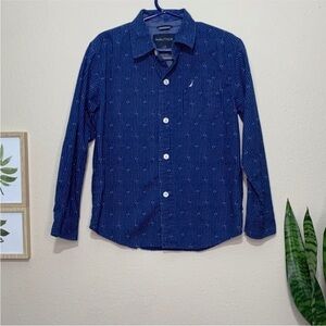 Nautica long sleeve shirt | Navy with white pattern | Side pocket | Labeled size 7 - looks much closer to a size 5/6 | See photos for measurements | Great used condition