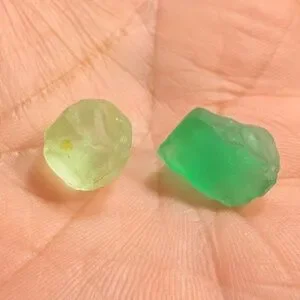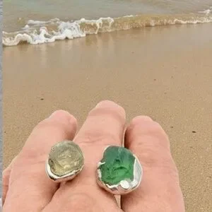 Crafted with care, this handcrafted ring showcases two unique sea glass stones in vibrant green and yellow hues, mounted on an upcycled silver spoon band.