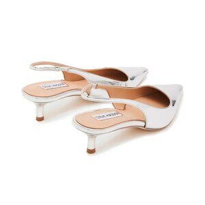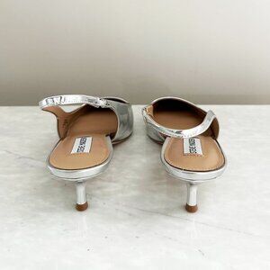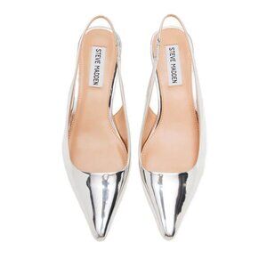 Brand new Steve Madden Kari Pump. This sleek, kitten-heel pump will add a touch of elegance to any outfit. Features a slim low heel, pointed toe, slingback style, and a metallic hue that's perfect for evening plans, holidays, and special occasions. Size: 10. Color: Silver. Excellent condition. Never worn. Minor signs of wear on bottom sole from store display. New without tags.