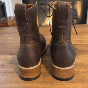 These Portland Leather heeled boots in a rich brown hue offer a stylish blend of elegance and ruggedness. Crafted from high-quality leather. The boots provide excellent support with their ankle-high design and are perfect for both casual and formal occasions. Never worn, New Without tags