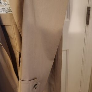 The item shown is a London Fog trench coat. London Fog is a well-known brand that has been producing classic, water-resistant trench coats since 1923. The coat in the image appears to be a classic double-breasted style in a khaki or beige color. Many London Fog coats, especially vintage ones like this might be, feature a removable inner lining for warmth and weather versatility.