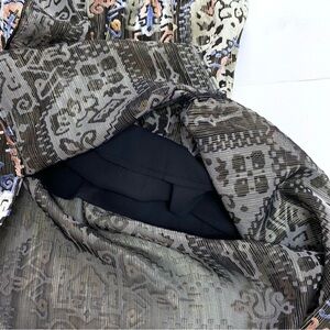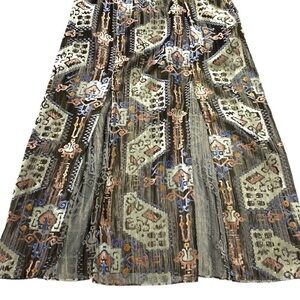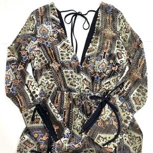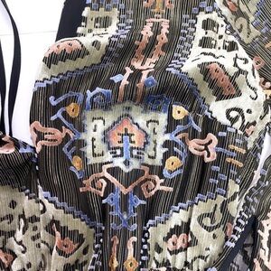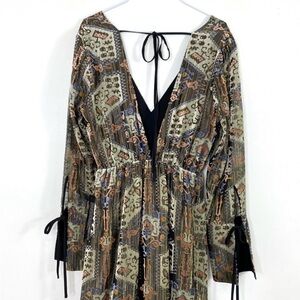 Brand new Topshop Devore Plunge Neck Midi Dress. This gold metallic and velvet burnout dress features a plunging neck, long sleeves with tie detail, black slip lining, high slits at skirt, deep v-back with upper tie closure, and midi length. Size: Medium. Color: Multi (Gold, Green, Brown, Purple, Black). Material: Velvet/Mixed. Excellent condition. Never worn. New with tags.