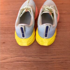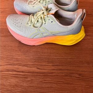 Asics Novablast 4 sneakers in light green with coral accents. Ideal for long distance running and workouts. Only 60 miles on them.