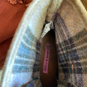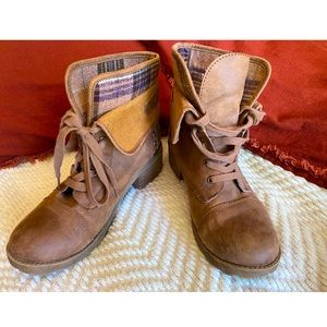 Stylish brown heeled boots. Features plaid lining and lace-up design. Perfect for casual wear.