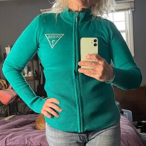 Chic GUESS turquoise Sweater with front zip. Fitted torso for Feminine Style!