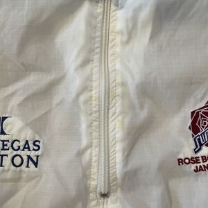 This Vintage 1987 Logo 7 Super Bowl XXI Rose Bowl STAFF Windbreaker Jacket in white is a collectible item perfect for any football fan. Made in the United States, this unisex adult size L jacket features the official logo of the National Football League (NFL) and commemorates the historic Super Bowl XXI game. The jacket is a unique piece of fan apparel that showcases pride in the sport of football and the excitement of the Super Bowl.