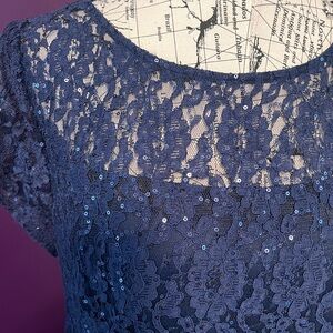 Worn once and washed. Love the sequins and tie at waist!!! Perfect for a wedding for formal event. No marks or snags that I can see. Looks great on!