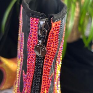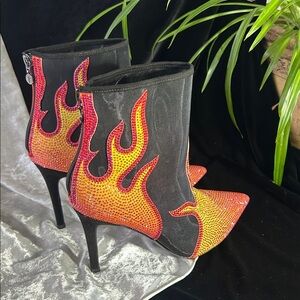 Gorgeous sparkling statement boots. Blazing flames on sheer black . Suede heels. Black part is slightly see through. Brand new without box but stored and shipped with great care. No longer available at Macys