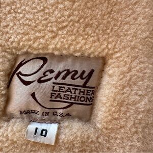 Authentic vintage Remy sheepskin shearling coat, a high-quality leather garment crafted in the USA. Remy is known for using fine imported skins and blending European craftsmanship with domestic production in Los Angeles, California.