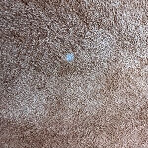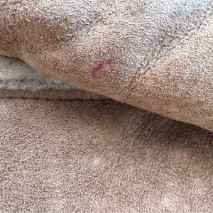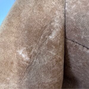 Suede shows areas of discoloration, light spotting, and darker stains on: