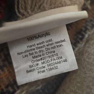 Cozy plaid scarf with fringe detailing. Features red, green, and tan colors.