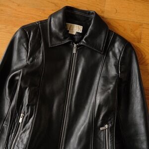 Classic black Michael Michael Kors genuine leather jacket in a sleek, minimal biker-inspired design. Soft leather exterior with full front zip, pointed collar, contrast stitching, and zip hand pockets. Fully lined with polyester interior for comfort and structure. Timeless, easy to style, and perfect for everyday wear or dressed up looks.