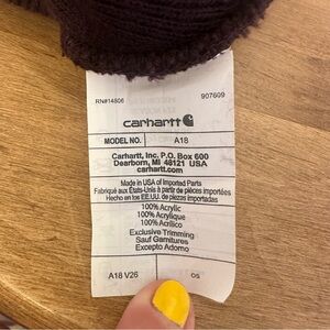 Carhartt dark brown beanie toque hat. Adult one size. In good used condition with no holes or staining. Classic hat with the Carhartt logo on the front of the folding trim. Style A18 V26.