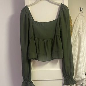 Chic green blouse with sheer long sleeves. Features a flowy, layered design. Perfect for versatile styling.