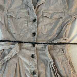 Chic light beige midi dress with button-up front. Features short sleeves and waist tie. Ideal for versatile styling.