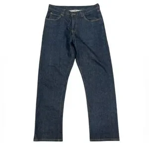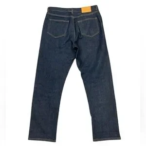 FEATURES: Blue color. Slim straight. Zipper fly. Selvedge.