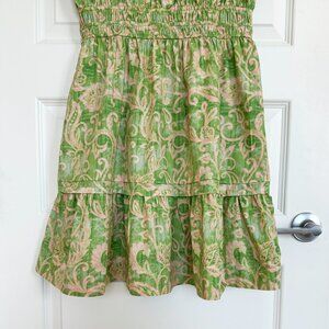 Brand new Velvet Heart Stilla Jacobean Floral Dress. This romantic and playful mini dress is a must-have for the summer season. Features a v-neck, short sleeves, smocked waist, pleat detail, ruffle hem, and lightweight cotton fabrication. Color: Green/Pink. Size: Large. Material: 100% Cotton. Excellent condition. Never worn. New without tags.