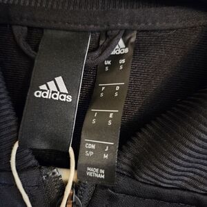 Stylish Adidas track jacket in black with iconic white stripes. Perfect for casual wear.