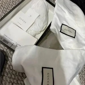 Gucci slides that have been worn! I’ve tried to clean the rubber part as you can see it has wear on both slides. Pictures will show the use of shoe. These are a size 7 but fit more of a 6.5. I will ship in original box with dustbags.