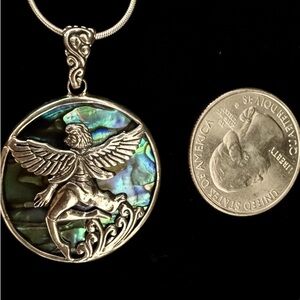 Elegant sterling silver pendant featuring a detailed angel design with a stunning abalone inlay. Perfect for adding a touch of elegance to any outfit. 20 inch chain included. Also see the matching abalone earrings in the next listing.