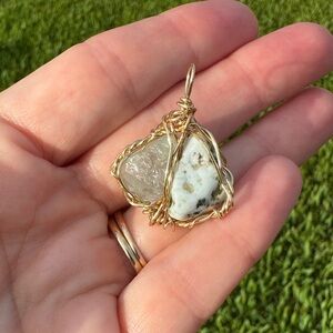 Larimar & Aquamarine Gold Wire Wrapped Stone Pendant Necklace. Crystal crystals. Made by the talented Topfashionenvy. Gold plating over stainless steel.