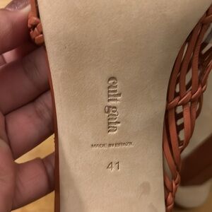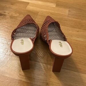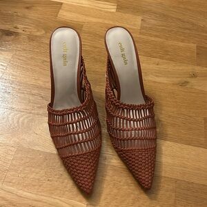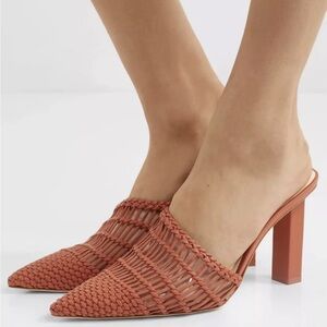 Artfully crafted woven leather mules from Cult Gaia. Pointed toe. 3" heel. Slip-on style. Leather upper, lining, and sole.