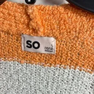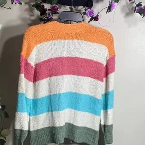 Brighten your look with this SO cardigan. Features bold stripes in orange, pink, blue, and green. Ideal for layering.