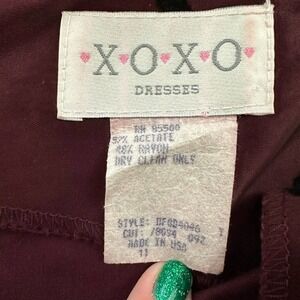 XOXO women's vintage y2k burgundy red and black flocked lace print mini dress, size 11. It is free from any rips or stains. It measures about 36 inches around the bust, about 30 inches around the waist, about 40 inches around the hip and is about 35 inches long.