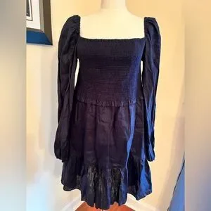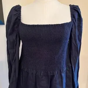 Chic navy dress with square neckline featuring long puff sleeves and smocked bodice. Tiered skirt adds elegance. NWT and no flaws.
