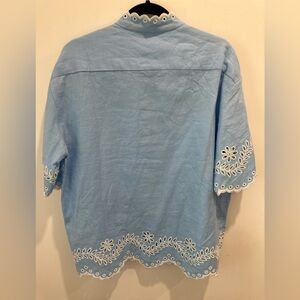 Elegant light blue top with intricate white embroidery. Features scalloped edges and button details.