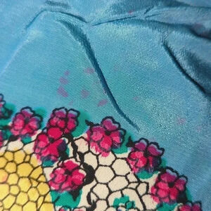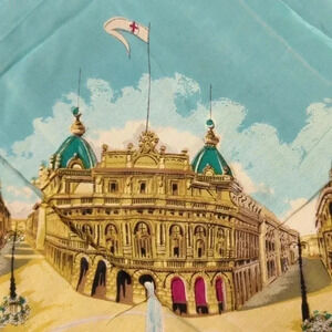 It looks to me like a souvenir from Switzerland, there are Swiss flags in some of the pictures. The corners show sins of wear and there are spots in a few places. The last picture is of a line of the woven fiber that somehow didn't take the dye, it does not appear to be a pulled fiber. I think it's a heavy weight silk, but it's textured and hard to tell. There are no tags at all. This item is heavily scented with the perfumed soaps my Mother and Grandmother kept in their drawers.