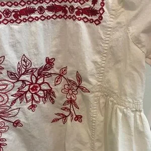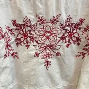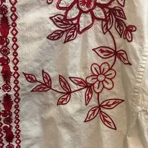 Textured 100% Cotton; Embroidery: 100% Polyester…swingy, oversized silhouette…intricate floral embroidery throughout…great used condition, no visible flaws, just needs steamed/pressed