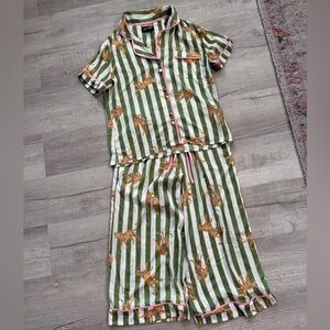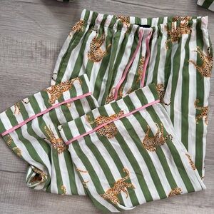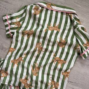 Relax in style with this chic pajama set featuring green and white stripes and a playful leopard print. Perfect for a cozy night's sleep.