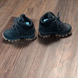 Stylish Timberland boots for kids. Black upper with tan soles. Ideal for outdoor play.