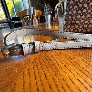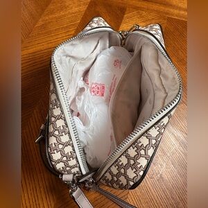 Crossbody bag, with adjustable strap. Two exterior slip pockets in back and front, zip closure. Silver hardware.
