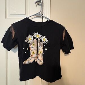 This stylish black t-shirt features a charming floral boot design, perfect for adding a touch of fun to any outfit. Comfortable and trendy, it's a great choice for kids.