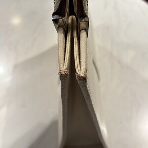 Aprox 10 wide by 9 tall. Signs of wear as pictured. Lots of life left in bag. Cream color. Silver hardware.