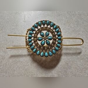 Elegant gold hair clip with turquoise accents. Perfect for adding a touch of sophistication to any hairstyle.