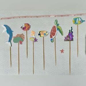 Enhance your party decor with these vibrant sea life picks. Featuring colorful fish and turtle designs, they add a fun aquatic touch to any celebration.